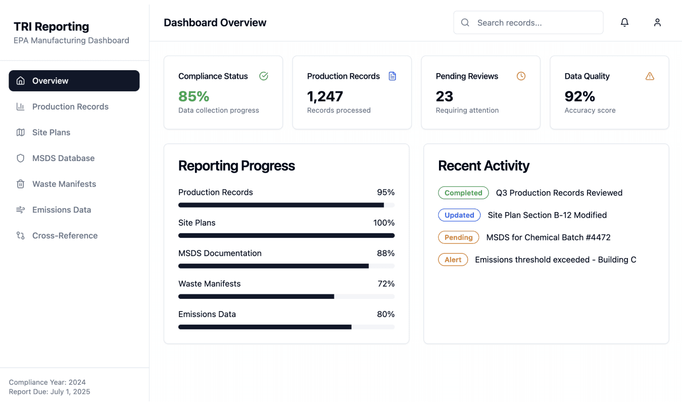 Your team didn’t train for years to cross-check spreadsheets and decode site schematics. Our TRI reporting agent reviews production records, site plans, MSDS sheets, and waste manifests—automating cross-referencing with emissions data to generate EPA-compliant reports with minimal manual effort.