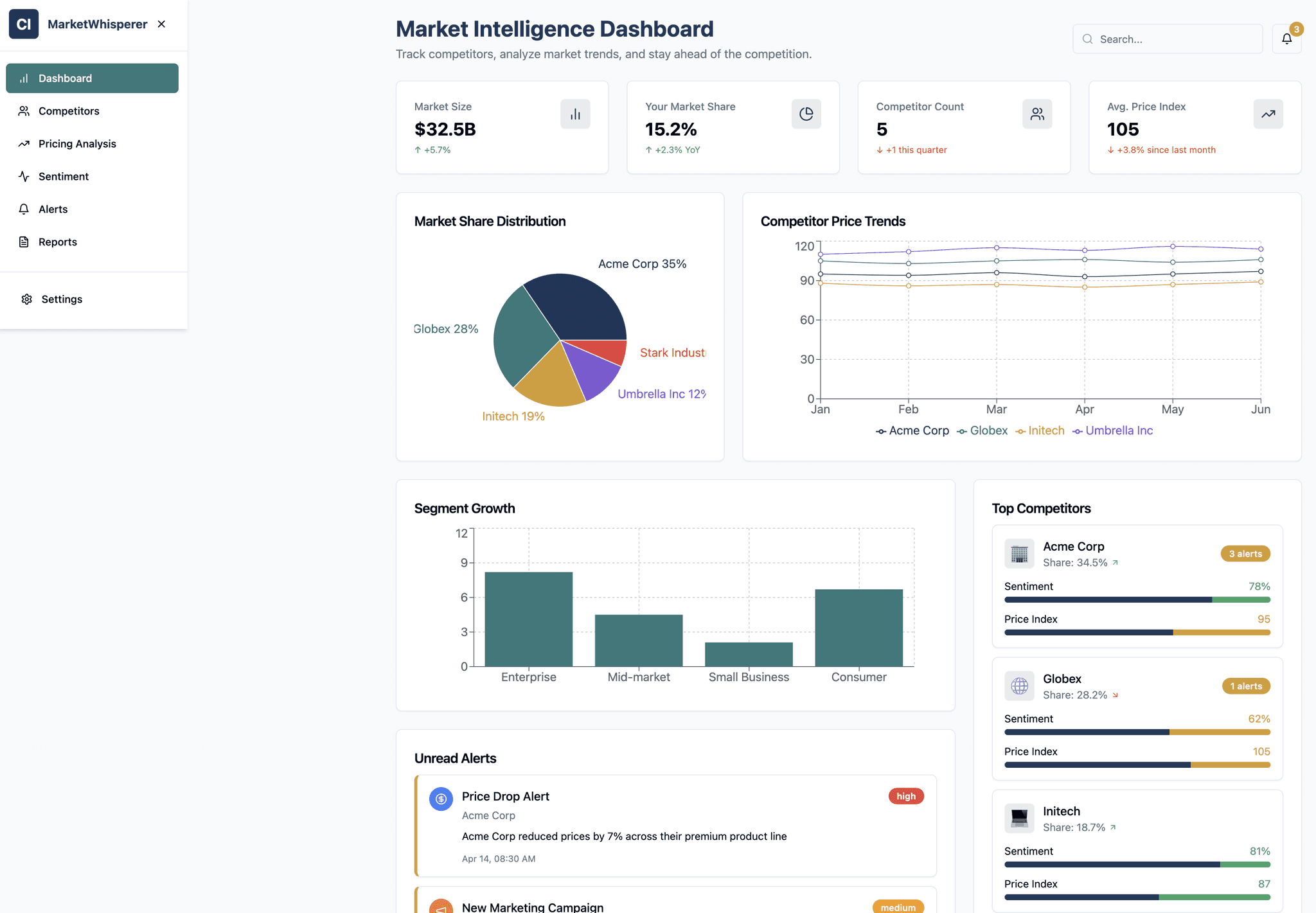 Market dynamics change constantly. Our Competitive Intelligence Monitor agent tracks competitor activities, pricing strategies, and consumer sentiment across markets, alerting teams to significant movements and recommending tactical responses.
